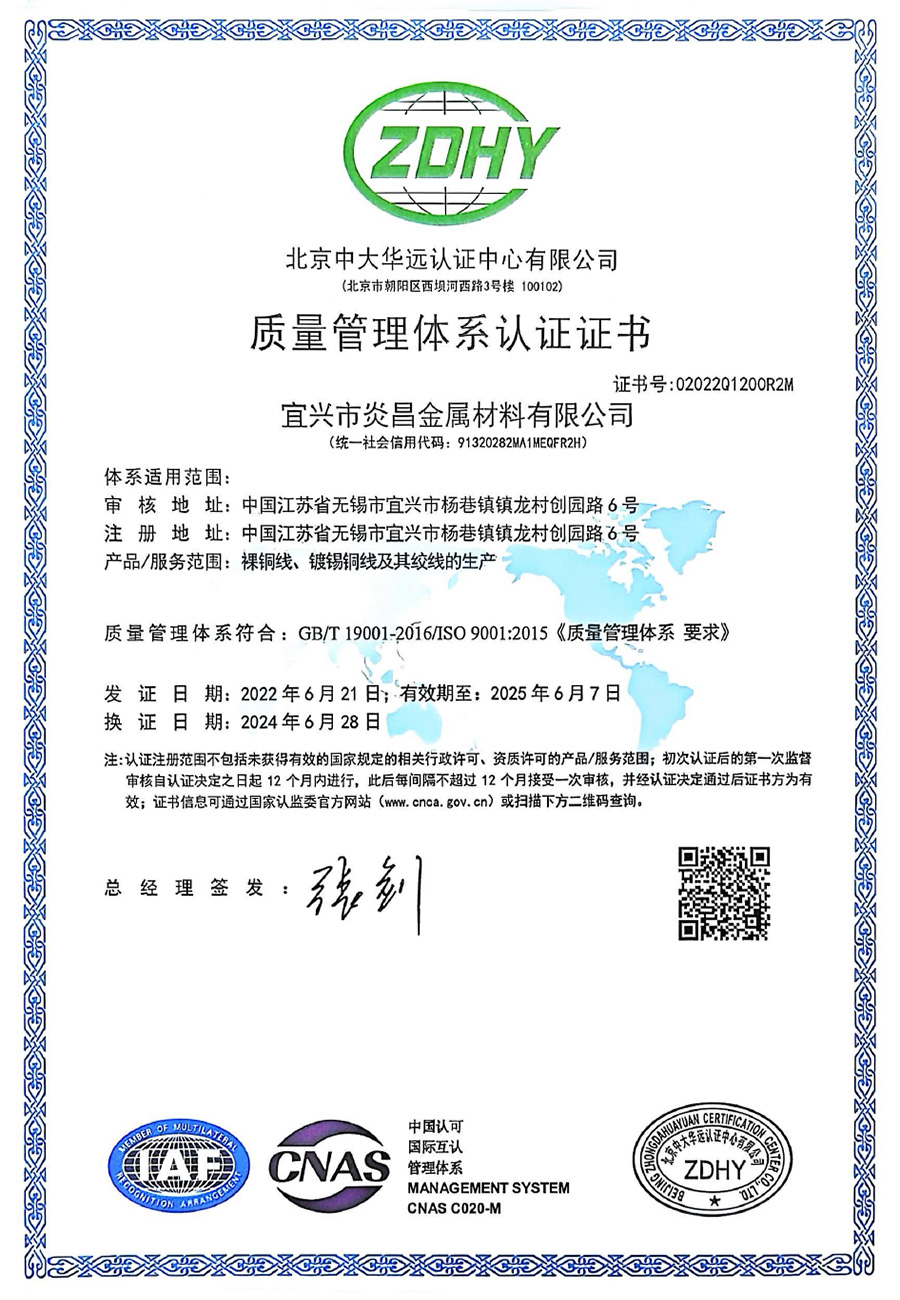 公司自成立以來,專注于銅絲加工工藝和技術的提升,嚴抓質量,品質在行業內有非常高的信譽和口碑,公司通過IS09001質量管理體系認證,目前年產能可達22000 噸。