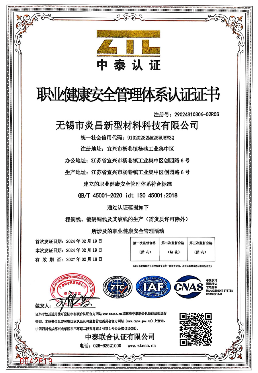 無錫市炎昌新型材料科技有限公司,是在原宜興市炎昌金屬材料有限公司的基礎上發展成立的,宜興炎昌成立于 2015 年,是一家專業從事銅導體材料研發、制造、銷售于一體的新型公司,是產品體系較為完整的銅絲加工生產企業。